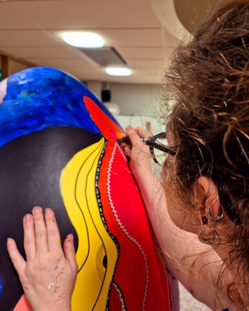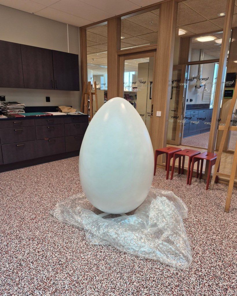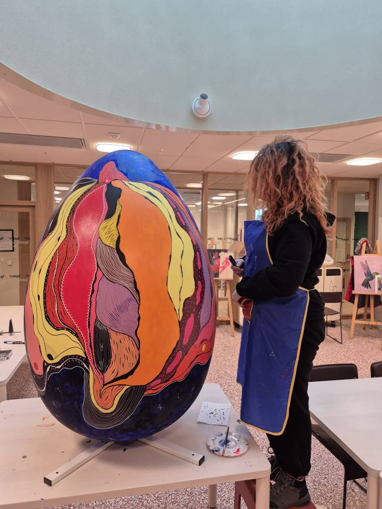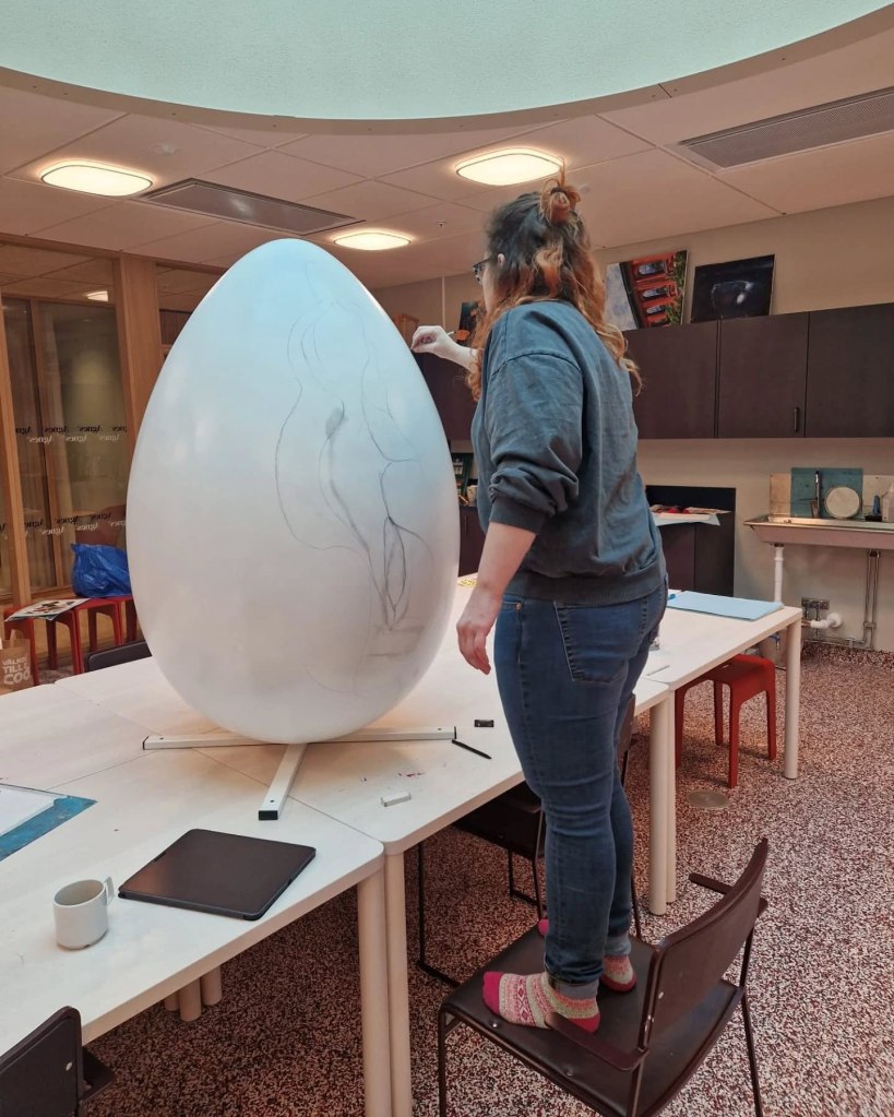 The installation is an acrylic and ink on fiberglass. The egg is 120 cm high and is delivered in the same “egg cup”..The artwork will be outside during 1,5 week s in Gävle city between 28/3 and 7/4 2024.